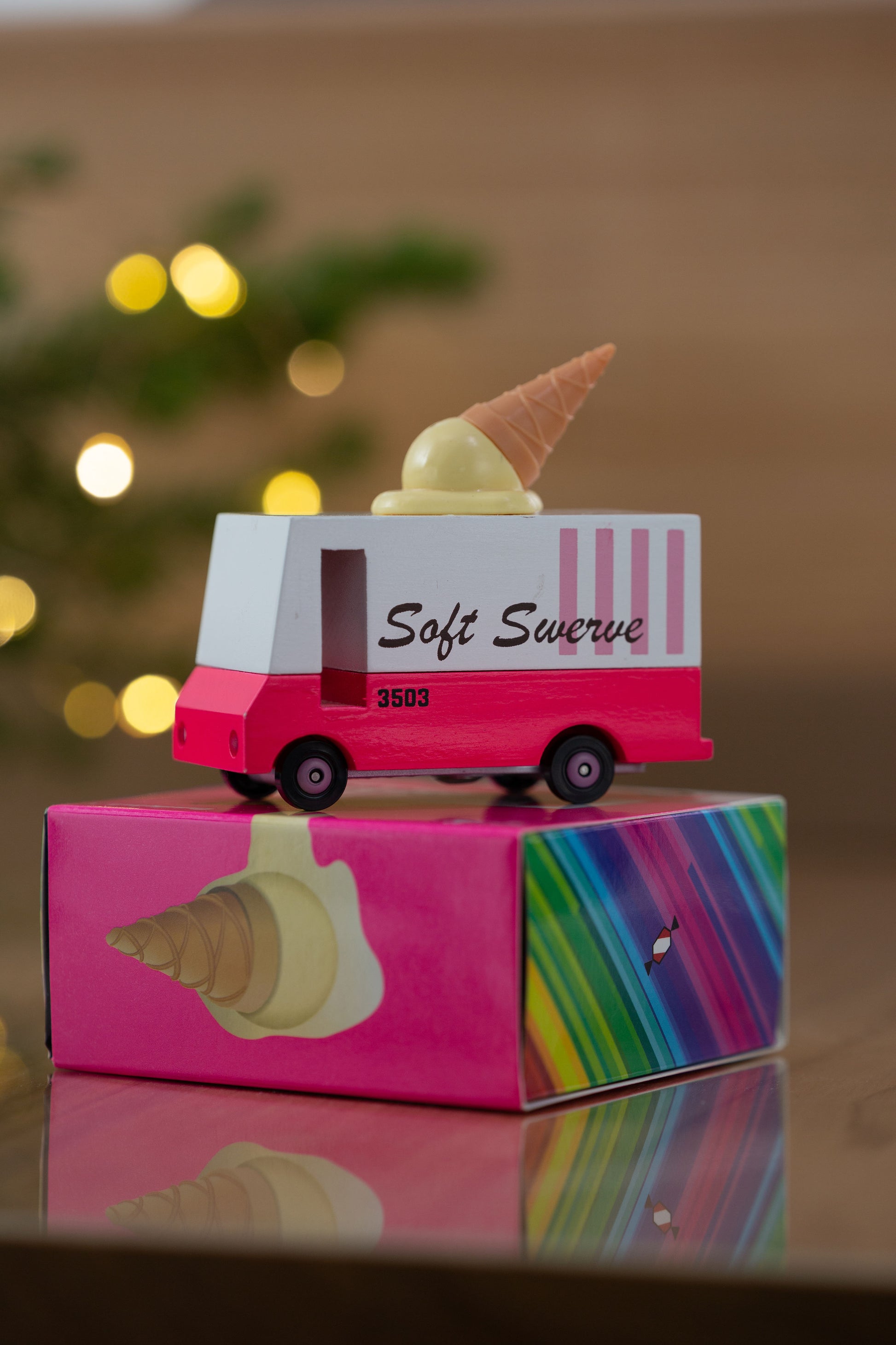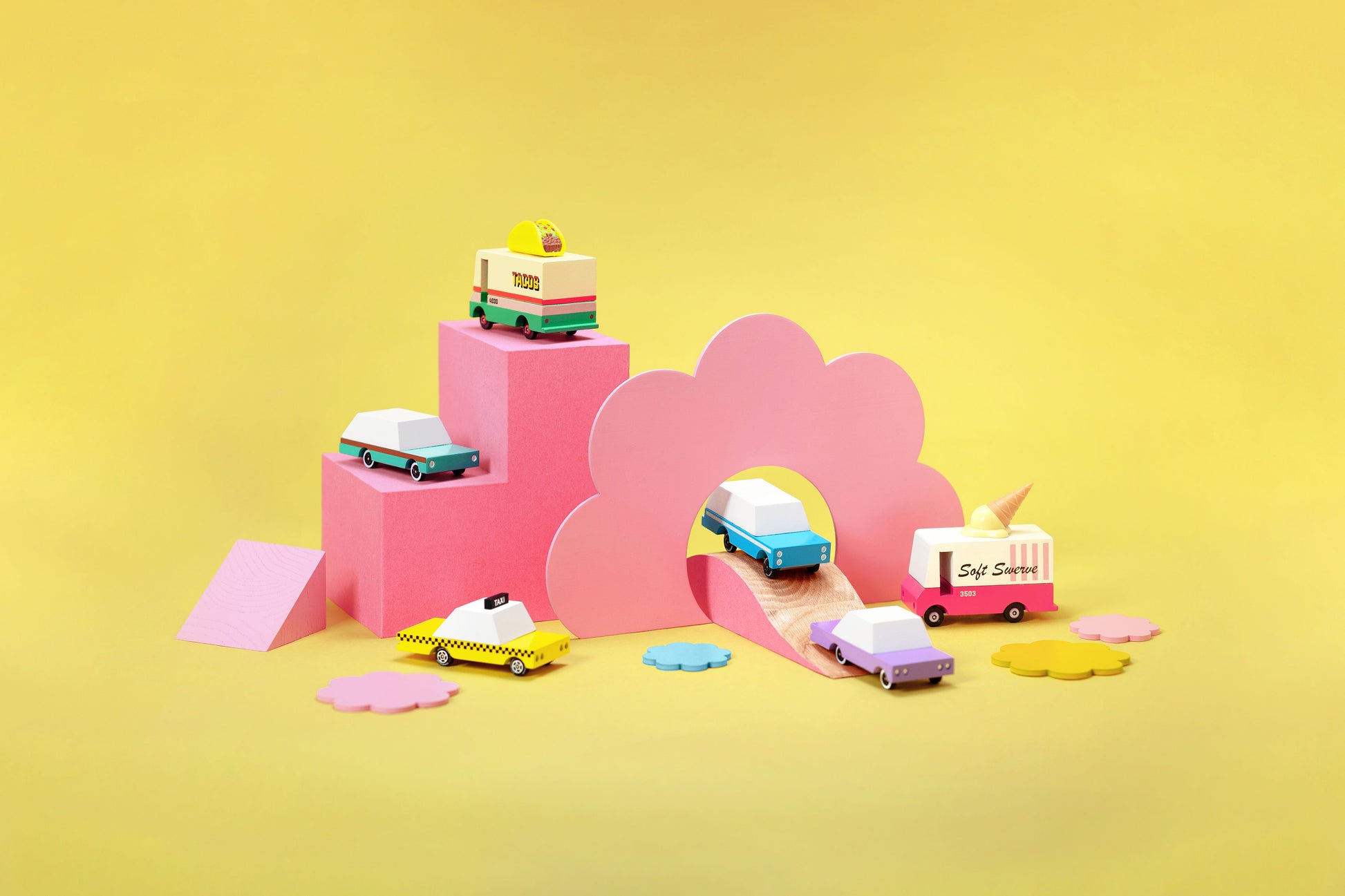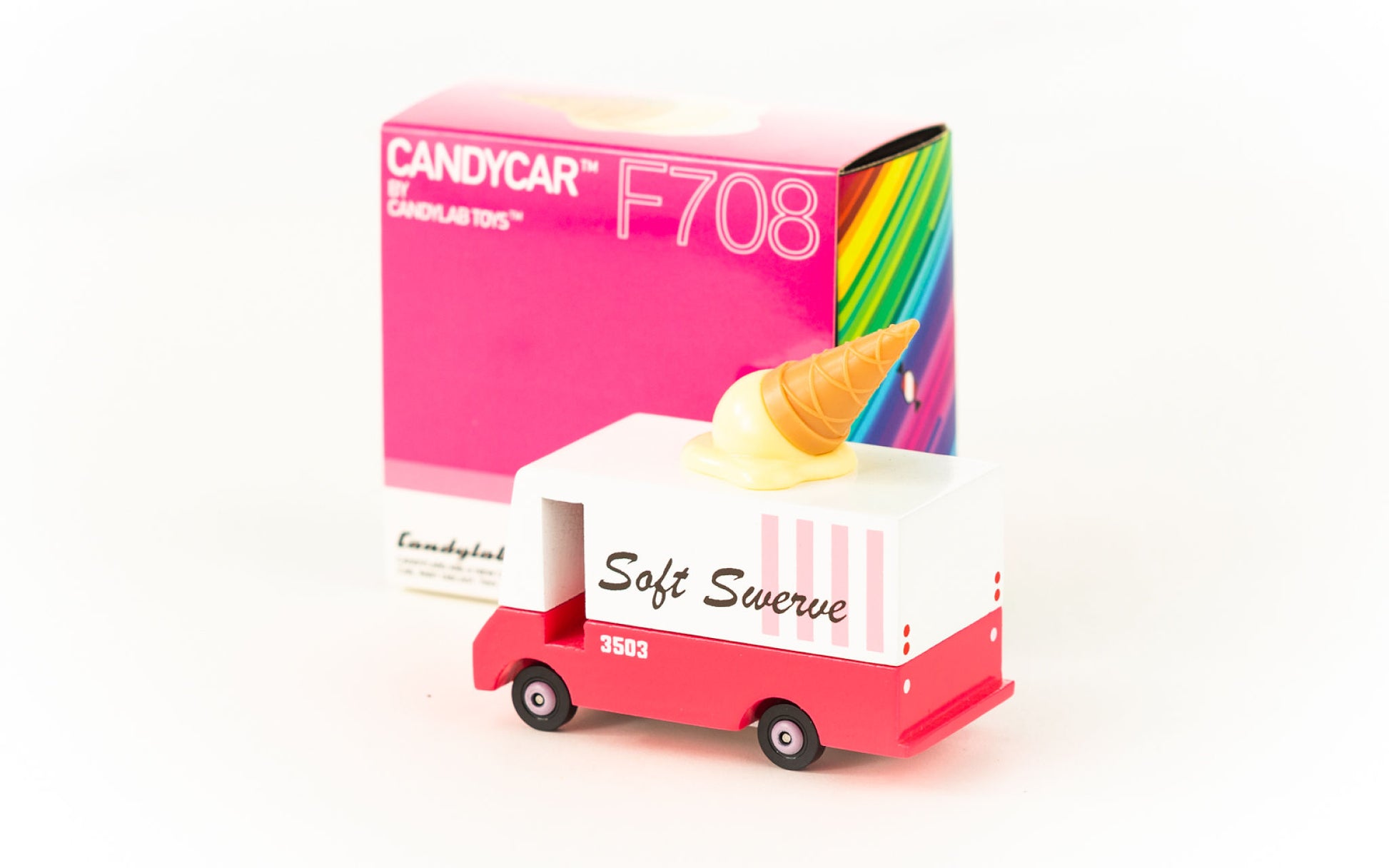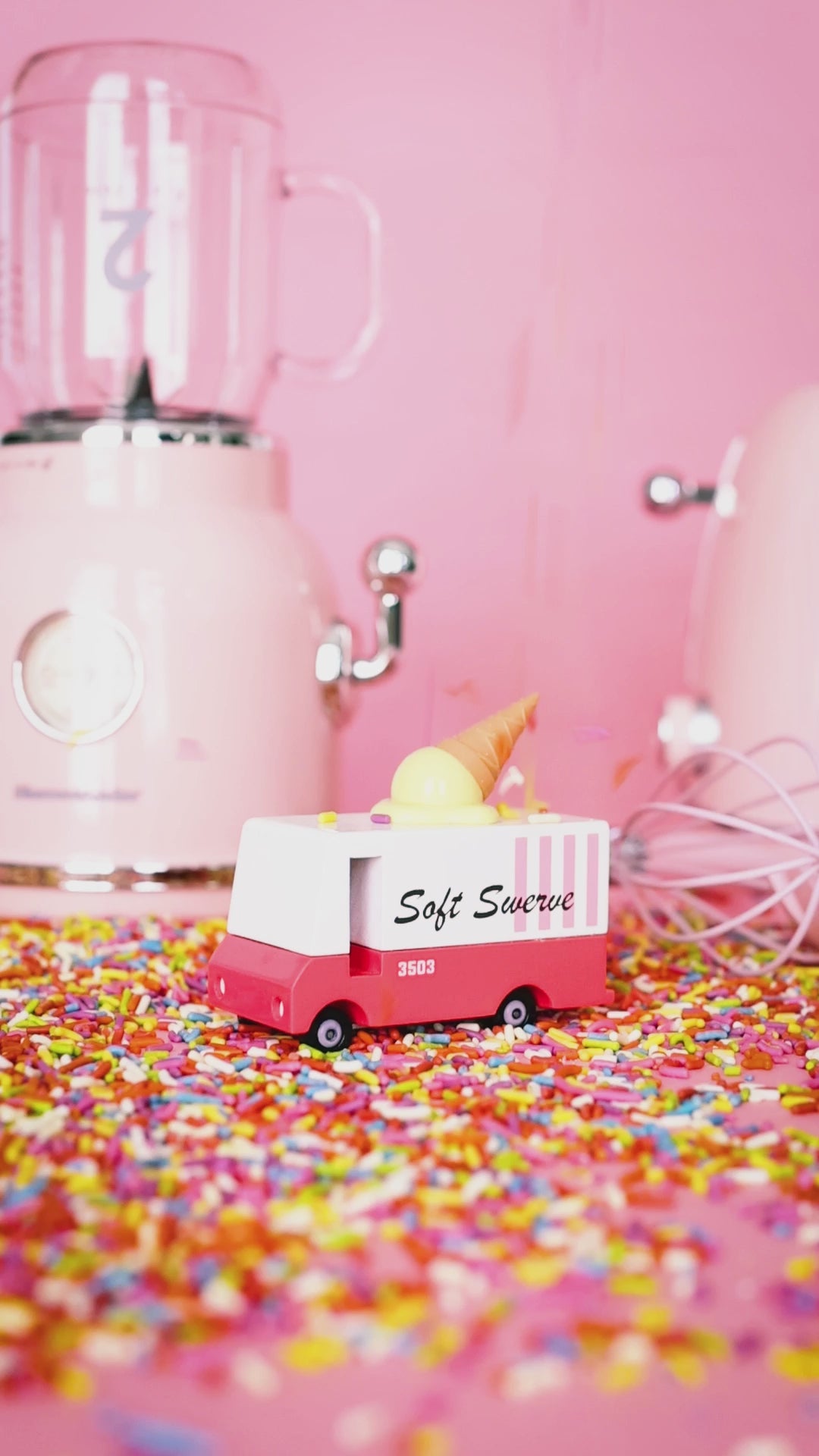 Soft-serving up good looks. As far as a symbol of simpler times and a carefree way to stuff sugar and calories in your childhood, you can’t beat the ice cream truck. We popped a melty top, added a bright pink base, sprinkled a pun, and voila! Iconic toy made. No ice cream truck jingle – you’re welcome.