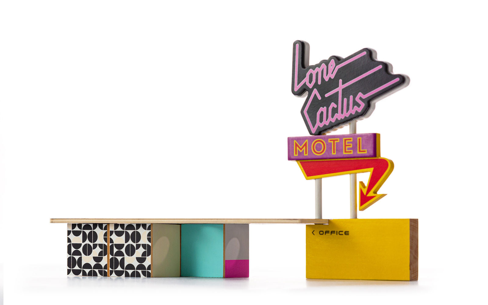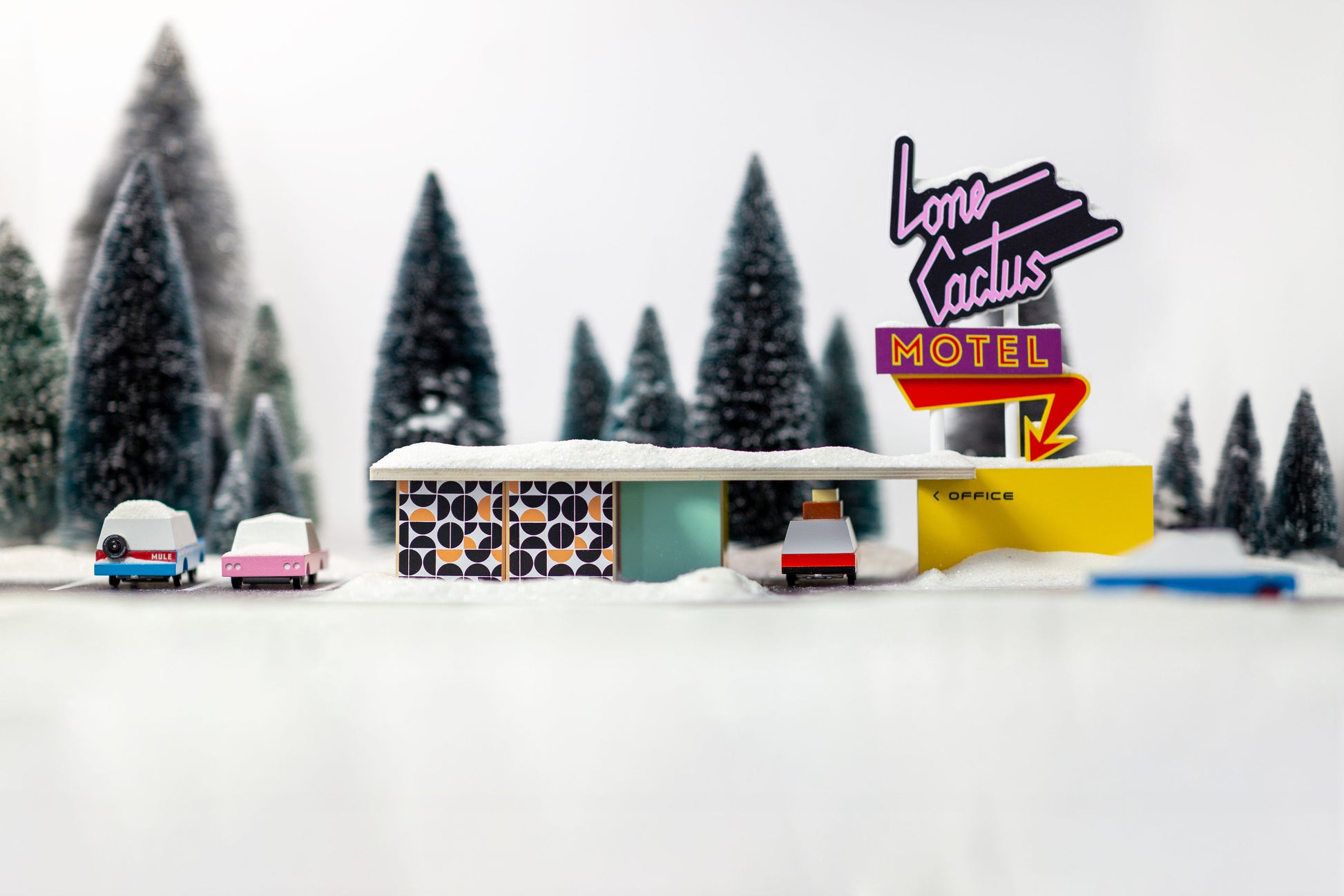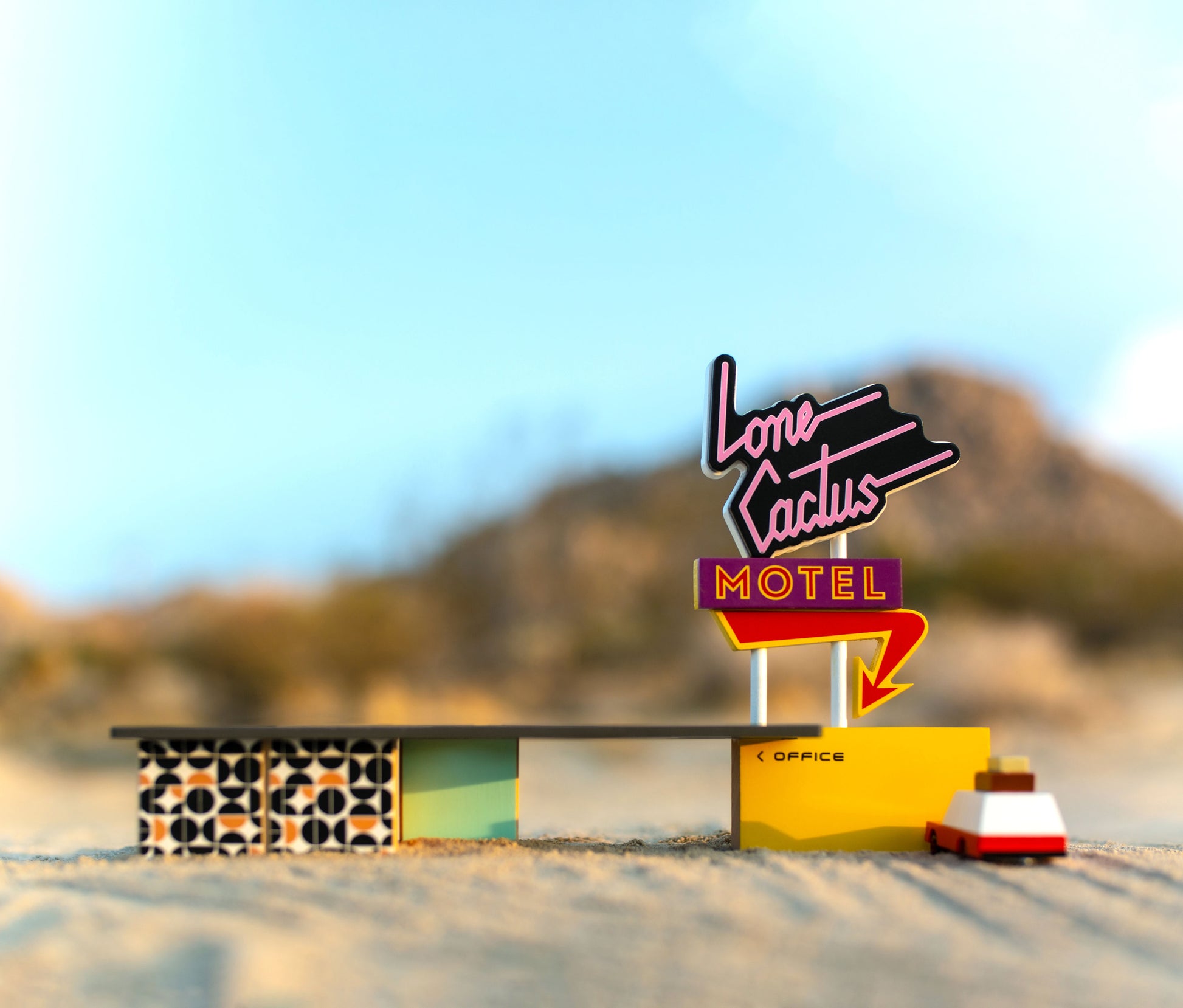 Remember, what happens at the Lone Cactus Motel - stays at the Lone Cactus Motel. Introducing our new Candycar compatible set. Decked out in mid-century patterns, free Wifi, and fresh coffee. You might not want to leave after you check in. Our newest STAC sets are modular building blocks that are ready for play - you can combine signs, roofs, and multiple blocks with a clever all-wooden system. Playful carchitecture play at its best.