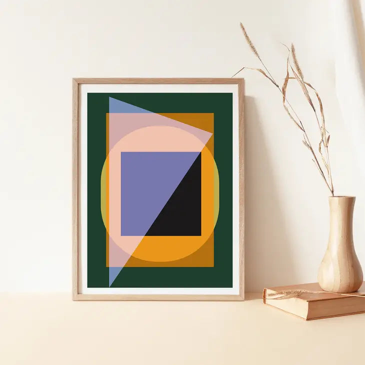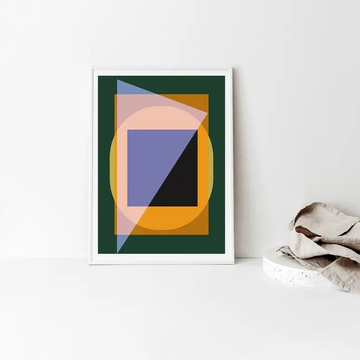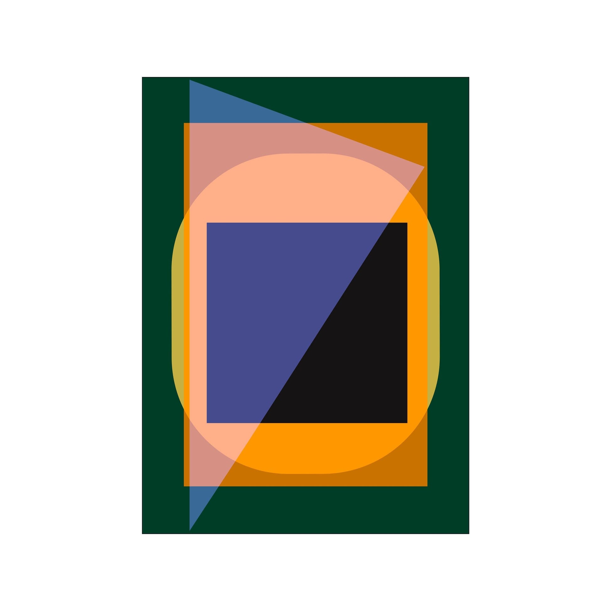 A spectrum-scale, overlap-focused print, based on a scale of primary overlaps and reverse gradation values. Neon hues, and rotating forms add energy and contrast to this print.